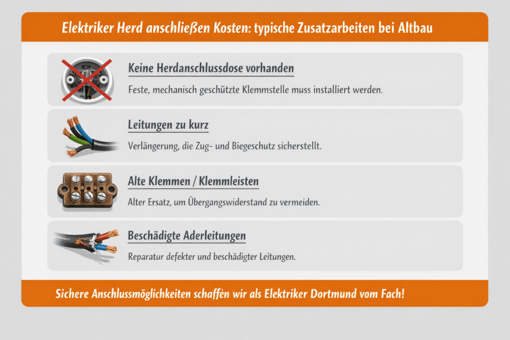 Elektriker Herd anschließen Kosten: typische Zusatzarbeiten bei Altbau, fehlender Dose oder zu kurzer Leitung