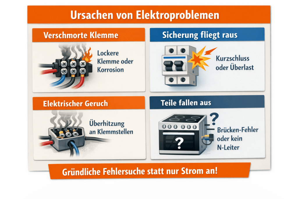 Wenn Klemmen verschmoren, ist fast immer Wärme durch Übergangswiderstand im Spiel. Das entsteht typischerweise durch lose Schraubklemmen, falsch abgesetzte Adern oder ungeeignete Verbinder, die unter Herdlast mechanisch nachgeben. „Fliegende“ Sicherungen sind dagegen eher ein Zeichen von Kurzschluss oder deutlicher Überlast.